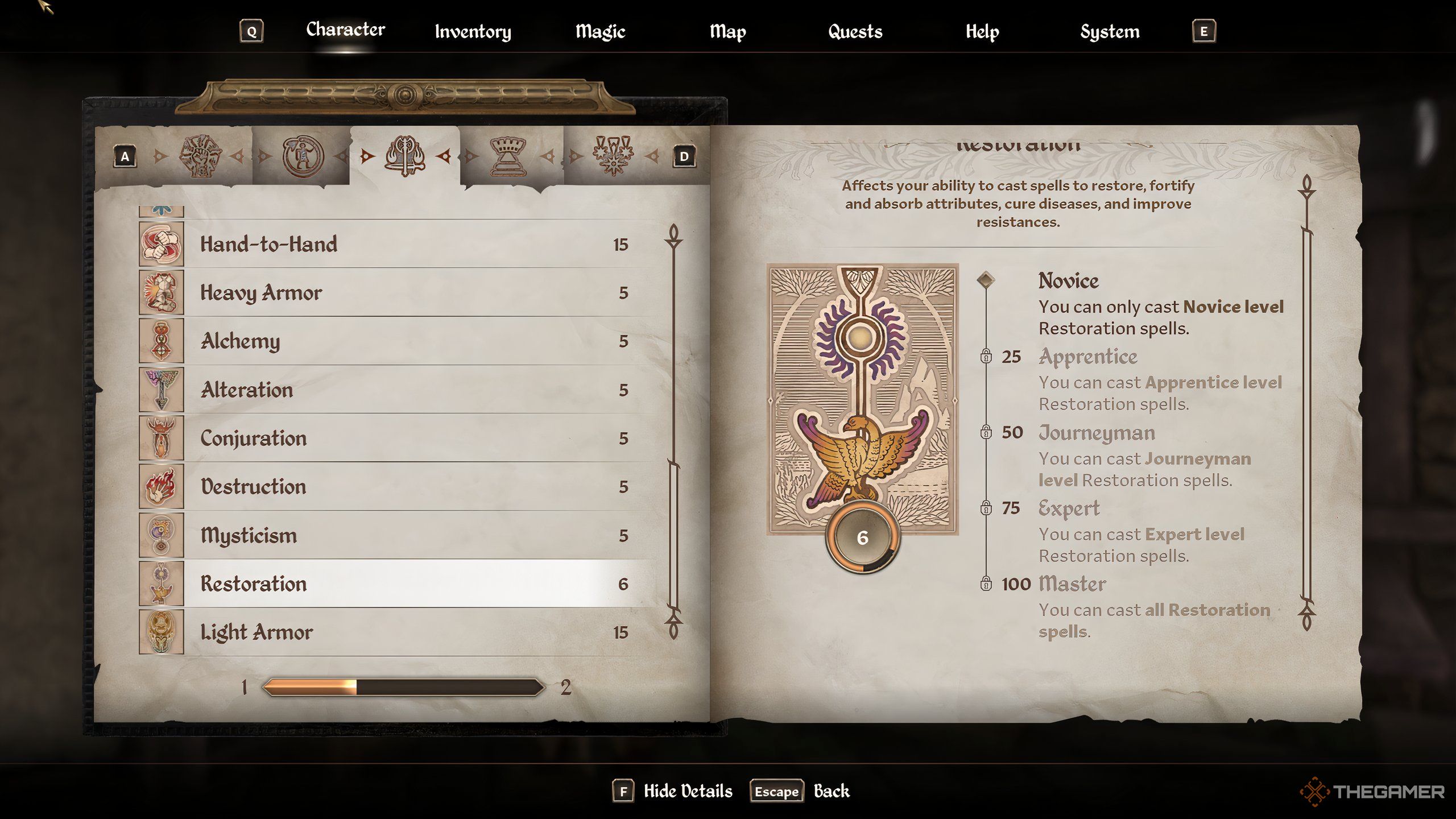 Oblivion Remasteredには、レベルアップして最終的にマスターできる合計21のスキルがあります。個々のスキルの開始値は選択したクラスに依存しますが、各スキルには5つの層レベルがあり、アップグレードされたティアごとにアクションと能力が大幅に改善されています。