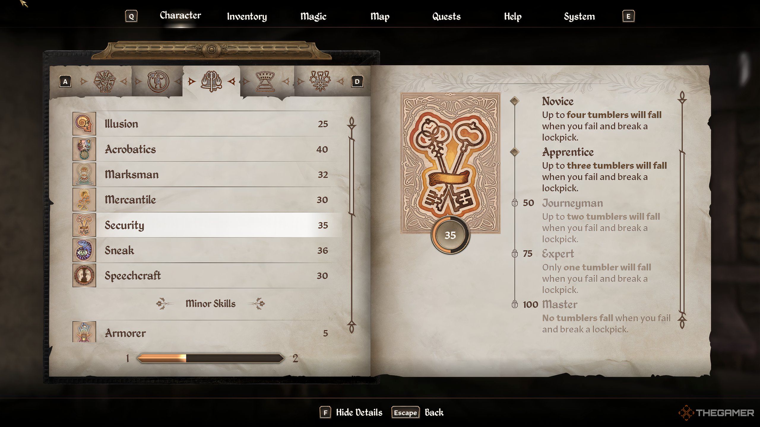 セキュリティスキルを向上させることは、都市の家の閉鎖ドアや城のさまざまな展示ケースを開こうとするのと同じくらい簡単です。また、ノクトゥルナルのDaedric Questを完了して、ロックピックを無駄にせずに困難なロックを快適に選んでみることができる報酬として、Skeleton Keyと呼ばれる壊れないロックピックを取得することもできます。ロックが自動的にリセットされ、無期限に選択できるため、泥棒の巣穴のロックされた胸にスケルトンキーを使用することは、セキュリティスキルを上げる良い方法です。