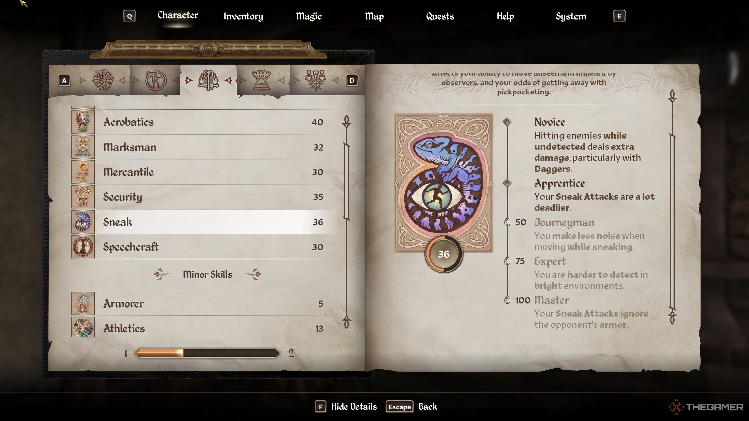 また、このスキルは、攻撃に対処するダメージをどの程度スニークするかを制御します。レベルが高ければ高いほど、スニーク攻撃が致命的になります。より高いスニークレベルには、キャラクターが日中に見つけるのが難しいなど、他の利点があり、敵の鎧を無視してより多くのダメージを与えて攻撃をこっそりします。スキルを向上させるのは簡単で、人々の周りに忍び寄るだけです。それを行う最良の方法は、夜に誰かの家に侵入し、彼らが眠っている間に歩き回ることです。