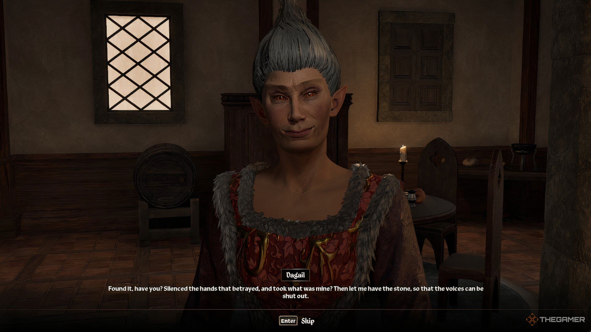 フォートブルーブラッドからマンジュンのamuletを回収したら、レイヤウィンのメイジェスギルドに戻り、もう一度ダガイルと話してください。先見者の石を見つけたと彼女に言ってください。彼女はついにあなたと普通に話すことができるでしょうクエストを終了して、推薦をしてください。