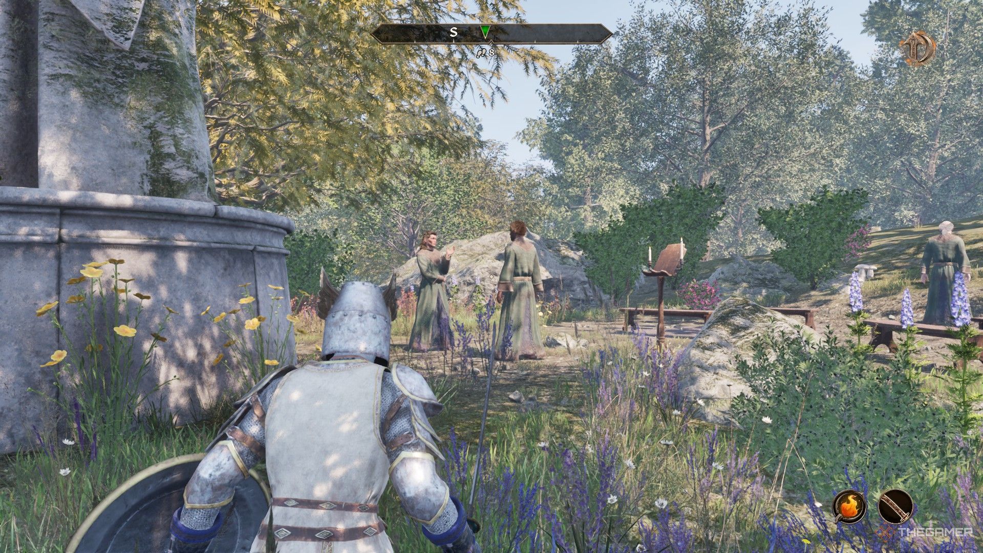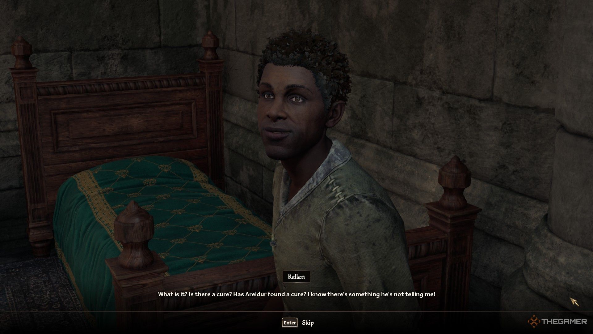 司祭はあなたをリダイレクトしますチャペルホールでケレンを見つけてください。彼は右側の部屋で休むべきです。ケレンと話してくださいそして彼に彼の呪いについて尋ねてください。役に立つと、彼はあなたが戻ってくるブーメランをしますアレルドゥールとチャットしますまた。