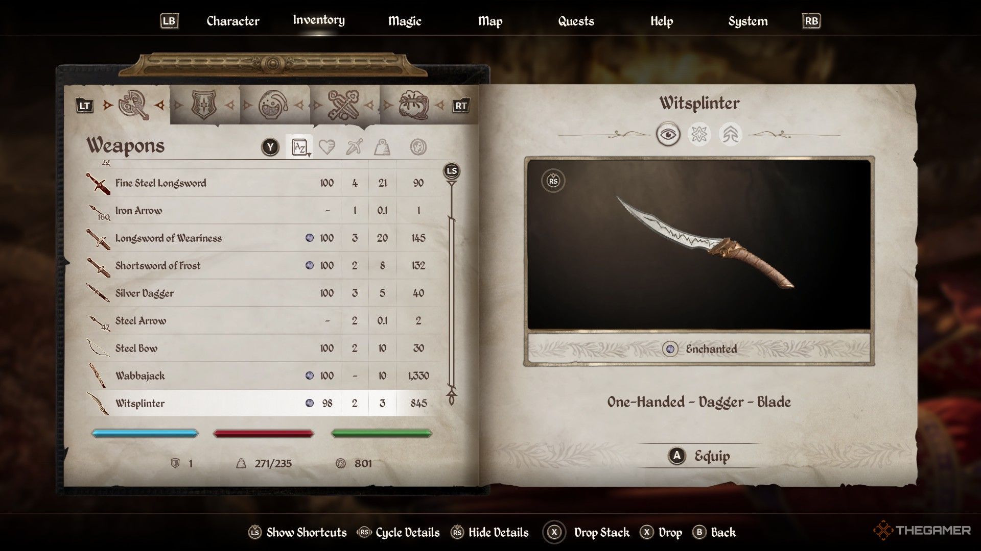 暖炉のすぐ下を見ると、いくつかの武器があります。その中にはそうですWitsplinterと呼ばれる短剣。それは排水インテリジェンスとそれに与える影響を与える魅惑的な武器であるため、必ずそれを選んでください。また、ここではスチールショートソードと鋼鉄の短剣を見つけることができます。