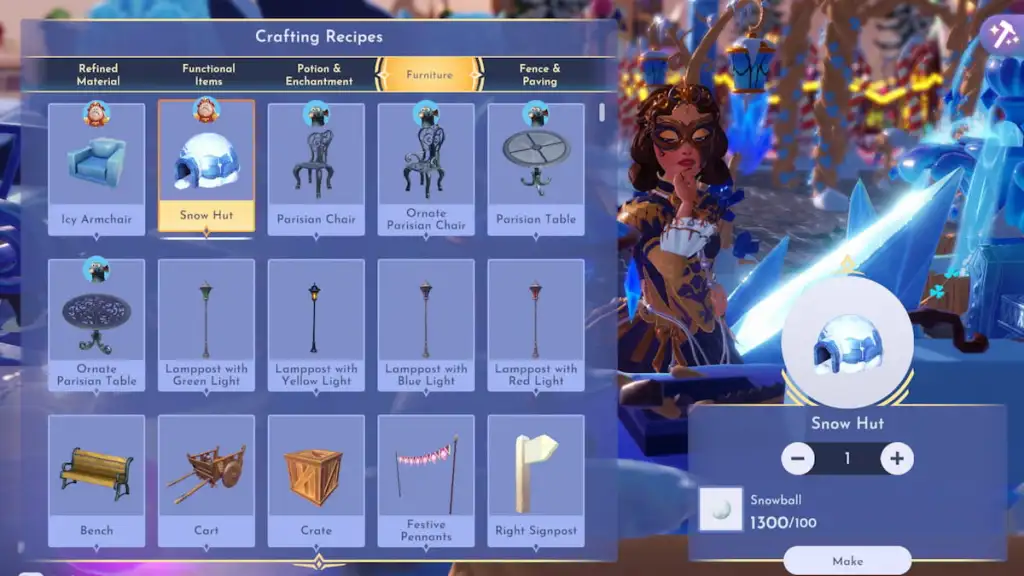次に、そうする必要があります2つの家具を作ります氷のような肘掛け椅子と雪の小屋を含むフェスティバルのために。それらを作るための材料がない場合は、最初に適切なリソースを収集するのに少し時間を費やす必要があります。これらのアイテムを作るには、たくさんのスノーボールが必要です。必要なものがすべて揃ったら、任意のクラフトステーションに向かい、家具タブに切り替えて両方の資産を作成できます。