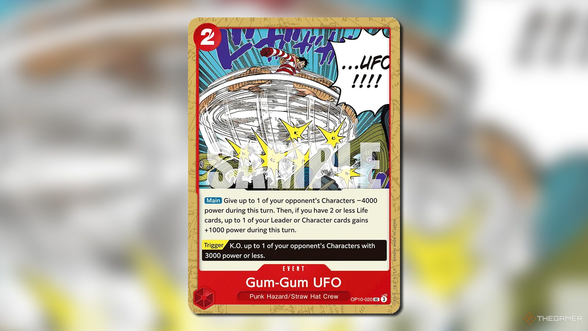 安価で効果的でパンチのあるイベントカードをお探しですか?ガムガムUFOはあなたの男です。わずか2コストで、敵の力を4,000に落とします。これは、最も恐ろしい見た目のキャラクターでさえ、スクイーズマシュマロに向かっています。しかし、待って、もっとあります!あなたのライフカードが2つ以下に減少している場合、カードは少しボーナスブーストを与えます。あなたのキャラクターの1つまたはあなたのリーダーは1,000のパワーを獲得します。