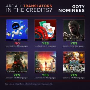 2022年に戻って、GotyまたはIndieのノミネート者(Horizon:Forbidden West)は1人だけでしたが、翻訳者のクレジットはまったく含まれていませんでしたが、他のほとんどは完全に信用していませんでした。これが意味することは、本質的に、数十の言語にローカライズされたゲームは、それらの1つまたは2つで働いていた人々だけに命名されたということです。 2023年までに、部分的なクレジットは、これら2つのカテゴリでほとんど消えていました。 11人の候補者のうち、4人には完全なクレジットが含まれ、7人にはまったく含まれていませんでした。そして、2024年には、ダニロフによると、10人の候補者のうち2人だけが翻訳者を称賛しません。