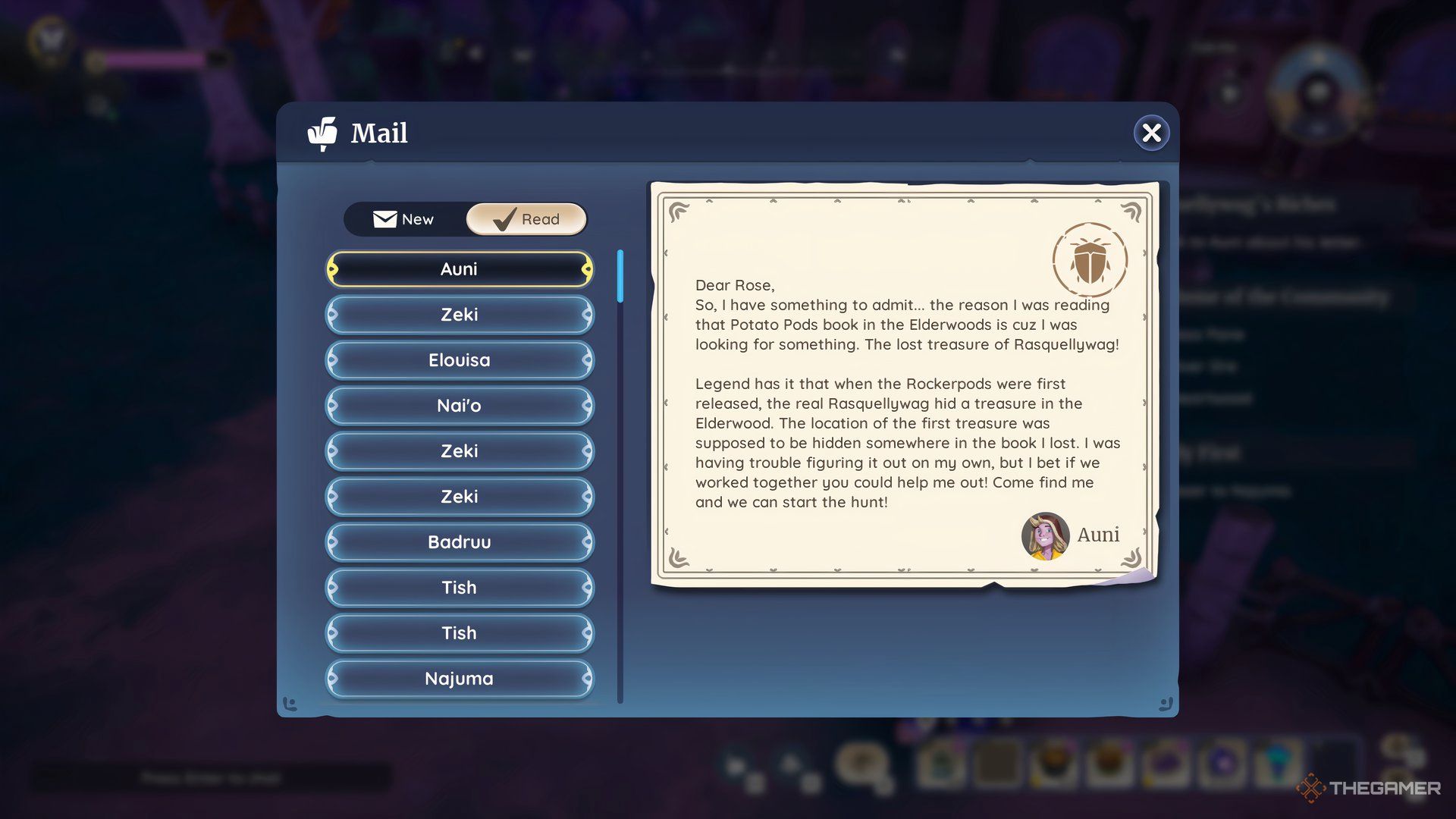 失われたそして見つかったクエストが完了した後、アウニから手紙を受け取ります、彼がそもそも本を読んでいた理由と、それをどのように失ったのかを説明しています。彼はを探していましたRasquellywagの宝物を失った、そして、手がかりがポテトポッドの本にあると確信していました!