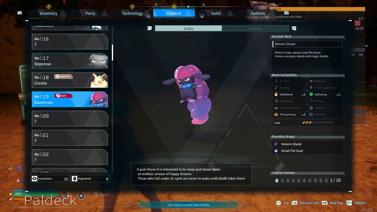 戦闘であなたを守ることをheしません魔法の弾丸あなたが火をつけているとき。それも強いので、ダメージを受けることをあまり心配しないでください。これとは別に、Daedreamは特に熟練しています仲間の仕事のようにクラフト、商品の輸送、 そしてリソースの収集あなたの基地で。もちろん、それは毒腺やPalの魂のようなものでもあります。