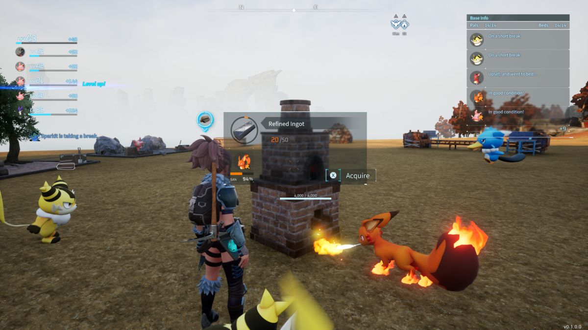 その後、キンドリングスキルを備えた少なくとも1つの火型PALをキャッチします。 Foxsparksは、このタスクに最適な早期ゲームオプションです。原始炉と対話し、インゴットのクラフト順序を配置すると、火型PALがそれに取り組み、インゴットを作ります。