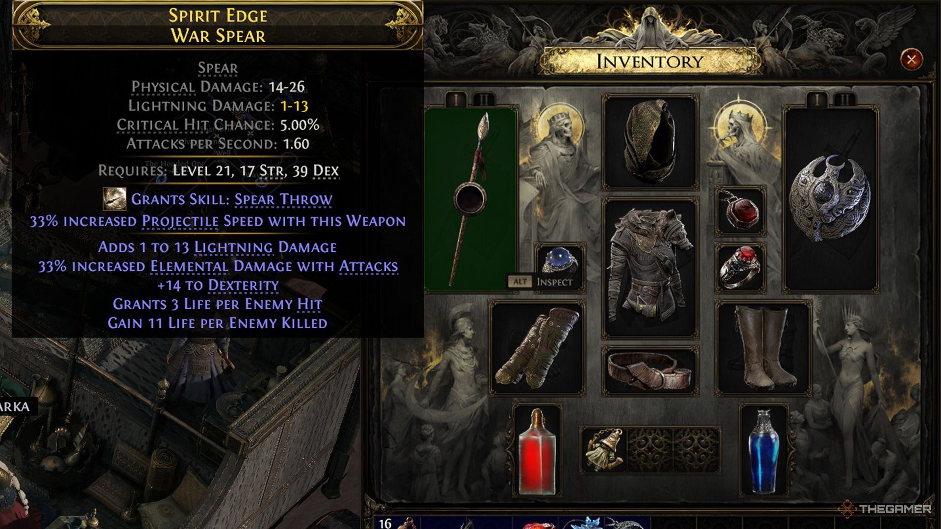 キャンペーンを通じてこのビルドを平準化するにつれて、目を光らせている最も重要なことは強い槍です。何かが増えた場合物理的損傷または稲妻のダメージ、それを脇に置いて通貨を使用して作成します。使用してください職人のオーブ必要に応じて槍にスロットを追加し、アイアンルーン(または、鉄のルーンがある場合は、より大きな鉄のルーン)のための最高のダメージが増加します。