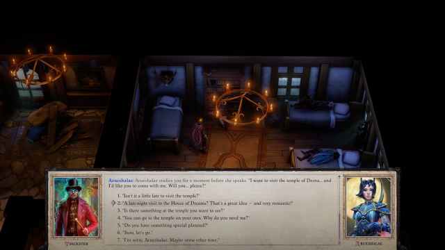 arueshalae- またはあなたが選んだ仲間 - あなたのベッドの横で待っていますそして、私がどのように感じているかを尋ねた後、彼女はあなたがデナの神殿で彼女に加わるように招待します。 「」などのオプションを選択することで、招待状について尋ねることができます。夢の家への深夜の訪問?それは素晴らしいアイデアです - そしてとてもロマンチックです!" または "あなたが見たい神殿に何かがありますか?「、すぐに彼女の招待に同意する」確かに、行きましょう。「または、彼女の招待を否定し、ロマンチックなイベントを「申し訳ありません、Arueshalae。たぶん他の時間。」
