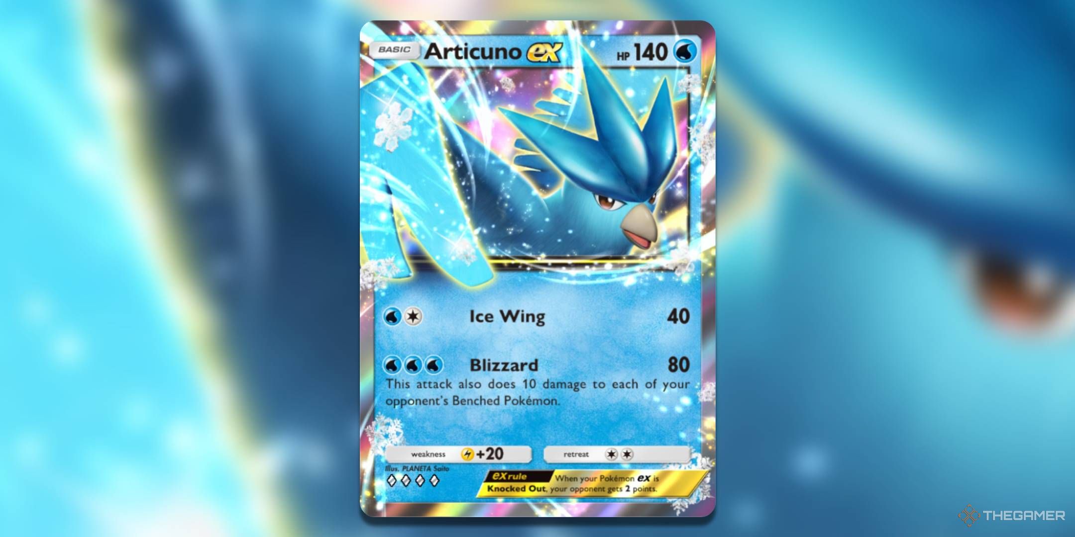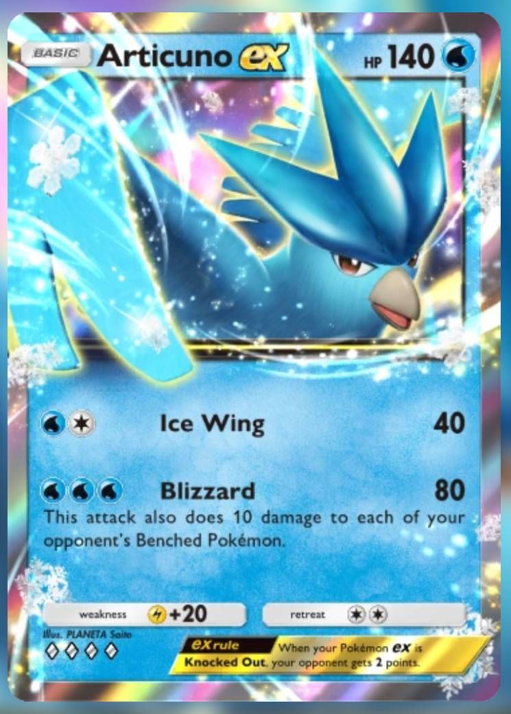 のために2つの水エネルギー、Articuno Ex取引40ダメージ。それはそれ自体が素晴らしいコスト比ではありませんが、もう1つのエネルギーのために、Blizzardは相手のアクティブなポケモンに80のダメージを与え、相手のベンチポケモンのそれぞれに10ダメージを与えます。
