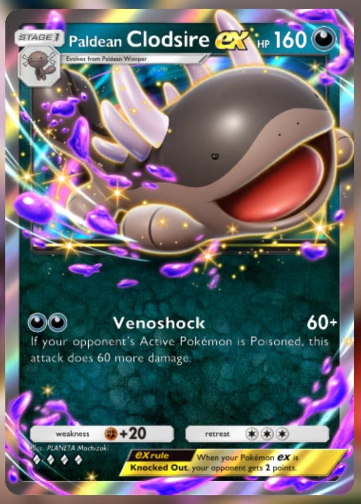 Paldean clodsire ex is2つの暗闇のエネルギーだけでなんと120のダメージを与えることができますその強力なVenoshock攻撃を使用します。唯一のトリッキーな部分は、最初に相手のアクティブなポケモンを毒する必要があることです。