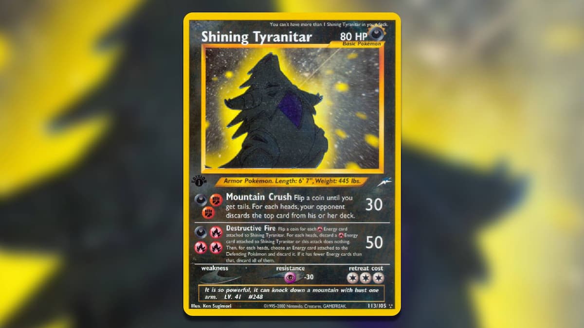 Neo Destinyの「輝く」カードは、史上最も有名で、最も困難なポケモンTCGカードの1つであるため、輝くティラニタールが最も価値のあるタイラニターカードとしてランクされていることは驚くことではありません。このカードは450ドル近くの価格帯ではありませんが、このカードの段階的なコピーを購入したい場合は、カードの状態に応じて700ドルから1000ドル以上を戻す可能性があります。