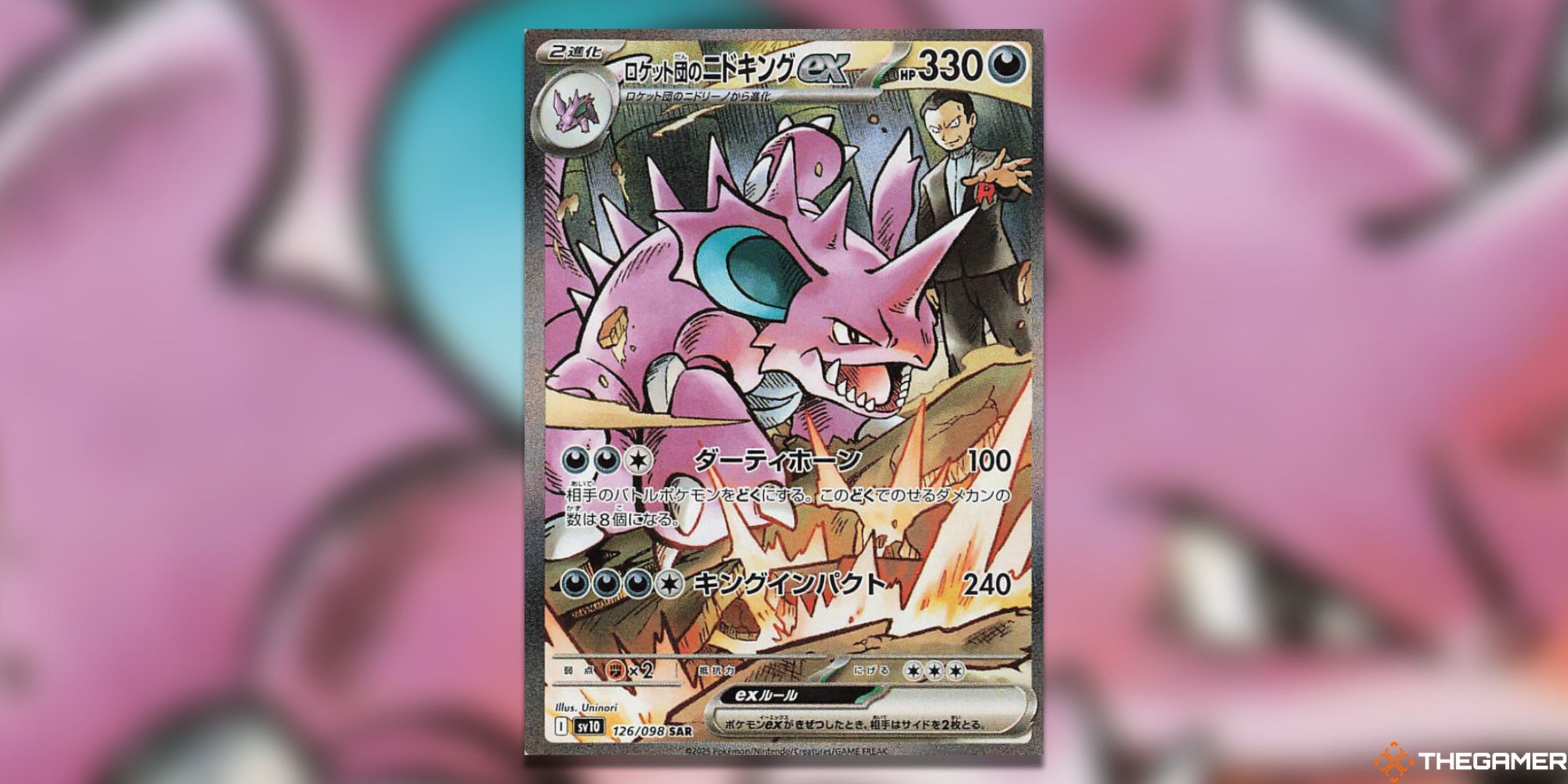 Team RocketのNidkingは、Team Rocketの栄光の中で最高のSARとしてトップスポットに対して正当な議論を持っていますが、セットの最も価値のあるカードとの厳しい競争に直面しています。 Nidokingの視覚的な魅力は計り知れないものであり、このシーンで使用されている明るい紫や他の色は、明るさの点で他のどのカードよりも際立っています。