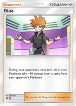 ![]() | ブルー /サポーター(トレーナー) | - | 対戦相手の次のターン中、すべてのポケモンは、対戦相手のポケモンからの攻撃から-10ダメージを受けます。 |