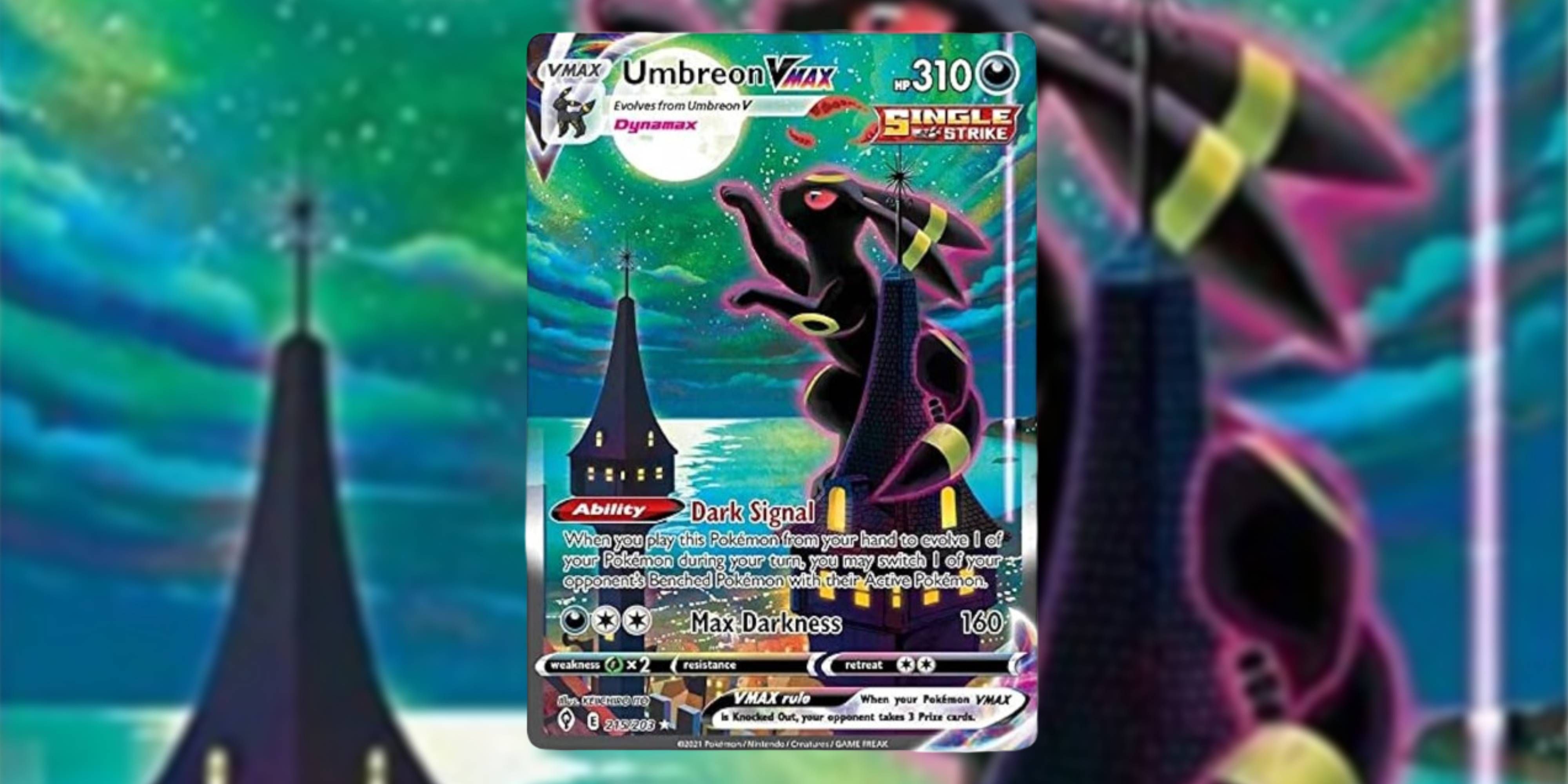まだ推測していない場合、このカードはポケモンTCGの有名なムーンブレオンカードへのオマージュです。 2021年の進化する空の一部であるオリジナルのムーンブレオンカードのアートワークは、塔に暫定的に腰掛けて、月に手を伸ばして触れようとしているウンブレオンを示しています。 VMAX Moonbreonの価値は、リリース以来徐々に上昇しており、今年初めにほぼ1,400ドルでピークに達しています。