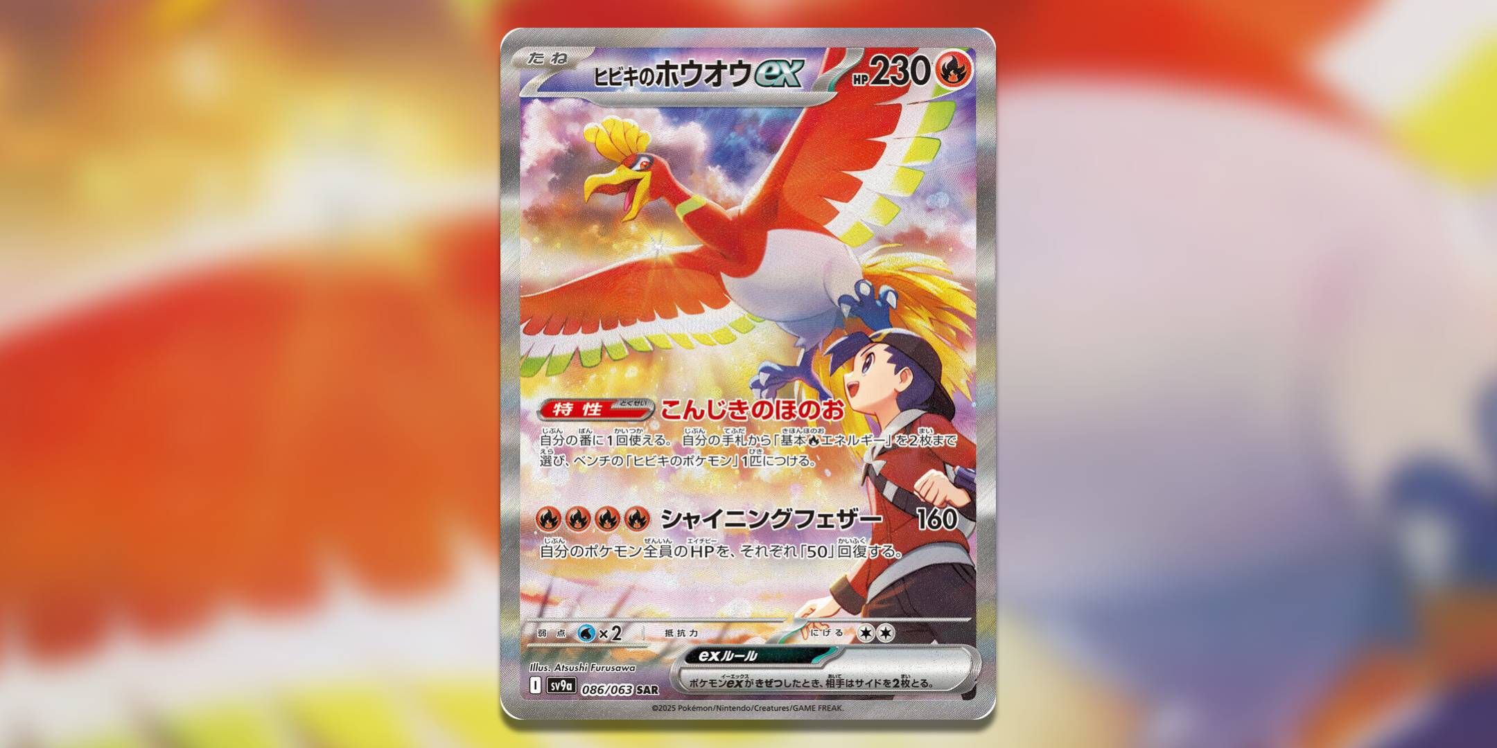 Ho-ohとEthanは、今回はイーサンのHo-oh Exと一緒に戻ってきました。このカードは、イーサンの上を飛んでいる伝説的なポケモンを特徴としており、トレーナーが冒険に出かけながらトレーナーを見下ろしています。