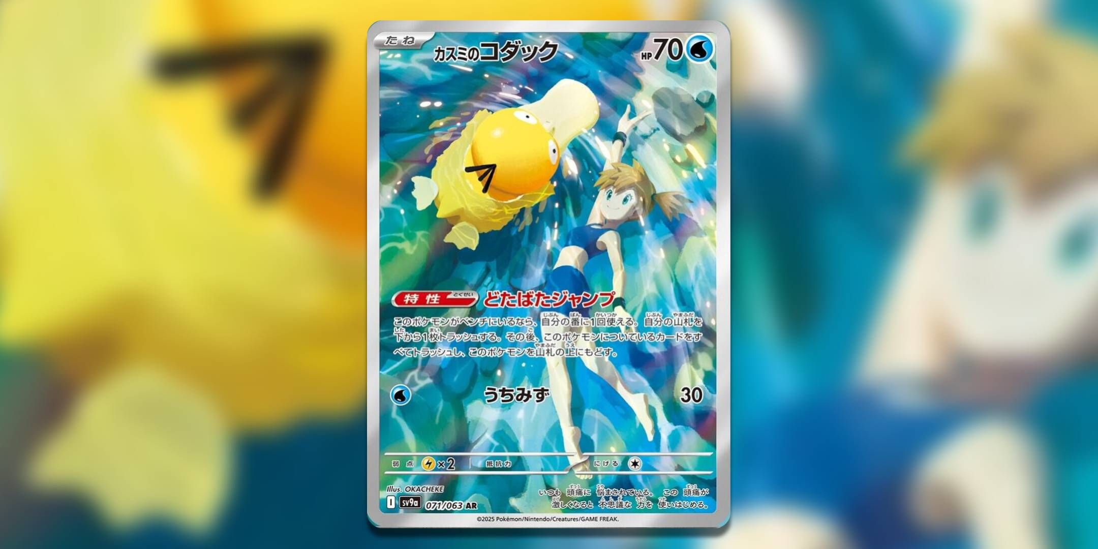 ポケモンアニメの最も人気のあるキャラクターの1人であるMistyは、MistyのPsyduckと一緒にトレーディングカードゲームに戻ります。 IllustratorのOkachekeの美しいアートワークは、2人の2人が透明な池やラグーンを通して一緒に泳いでいることを特徴としており、穏やかなイメージを作っています。