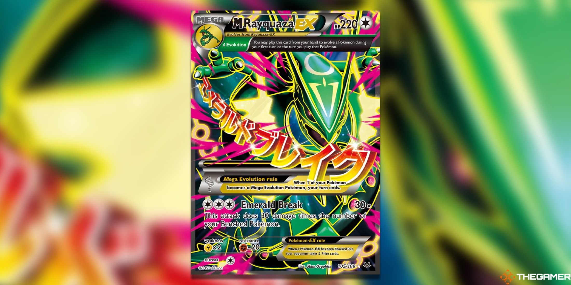 レイカザは、このメガの進化した伝説的なポケモンが鮮やかな色の爆発を吹き込んだ明るい緑のデザインを誇っているため、最も価値のあるro音のカードにぴったりとグリップを保持しています。この完全な芸術は、まだ来ていない別のレイカザには及ばないが、前かがみではない。