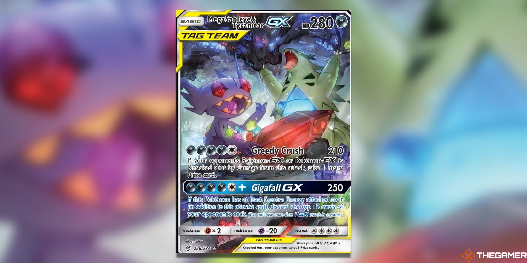 統一された心の中で最高のチェイスカードのいくつかに精通していない場合は、セットで最も見事なカードの1つであるMega Sableye&Tyranitar GXの1つを紹介する準備をしてください。このダークタイプのデュオは頻繁に登場しませんが、Mega Sableyeをフィーチャーしたこの美しいタグチームカードで時間を最大限に活用しました。