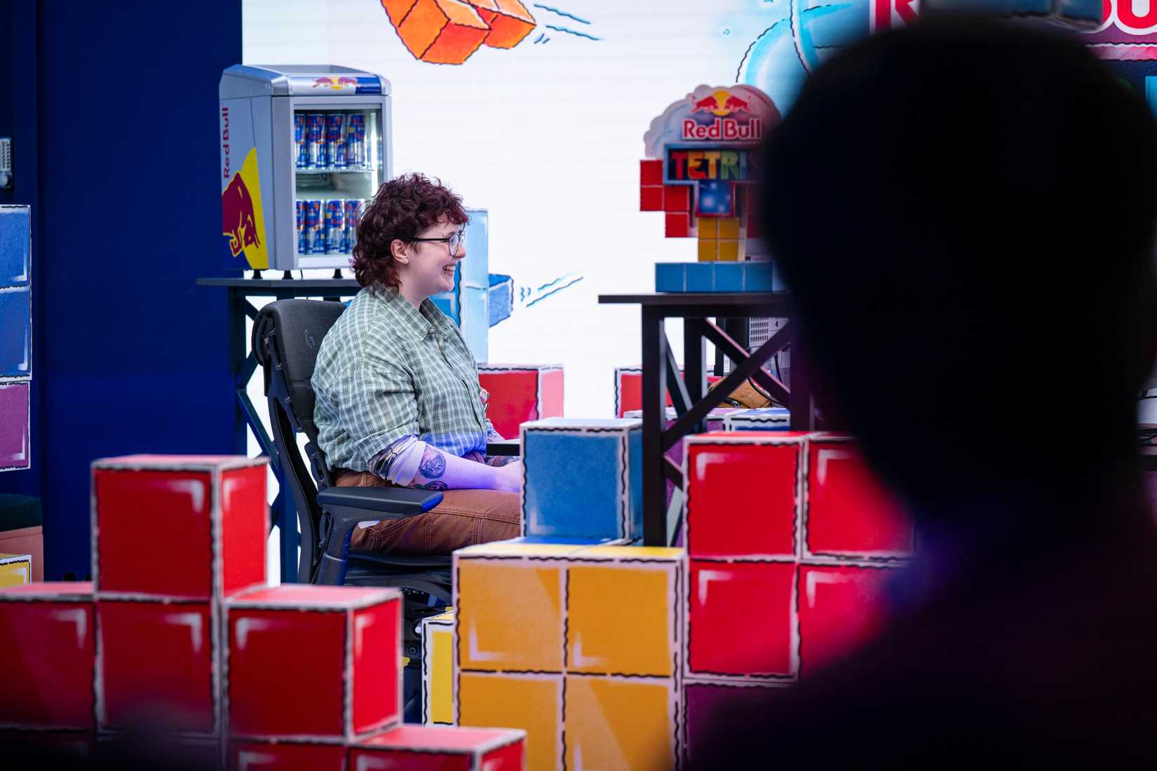 ステージにはテトロミノ ブロックがあちこちに散らばっており、すべてのアクションを収容できる 2 つの主要なゲーム ステーションが用意され、勝者を目指す人が腕を磨くための練習場所がたくさんありました。 8 人のプレイヤーがシングルエリミネーション形式で 1 対 1 の戦いに参加するよう招待され、準決勝ではゆっくりと、しかし確実に決勝進出者が決まりました。