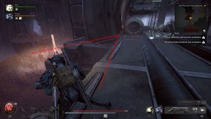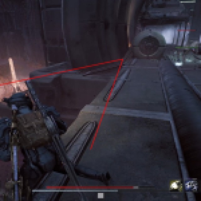 次に、左に出て、遠端にグライダードローンが付いた作物畑を見つけます。遠くの穴から赤い光が来ることに気付くでしょう。それに到達するには、下の紫色の液体で隙間を渡る必要があります。グライダードローンに飛び乗って下降します。スペクターを含む電気網を超えて数人の敵に直面する準備をしてください。