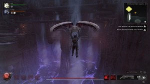 地面にある有毒な紫色の液体を渡るには、2つの上昇気流をキャッチして、反対側に安全に着陸する必要があります。