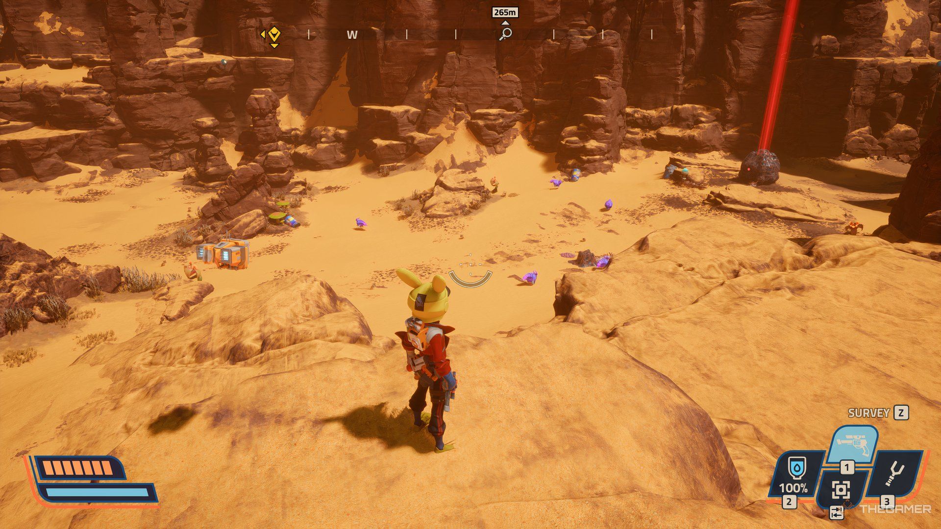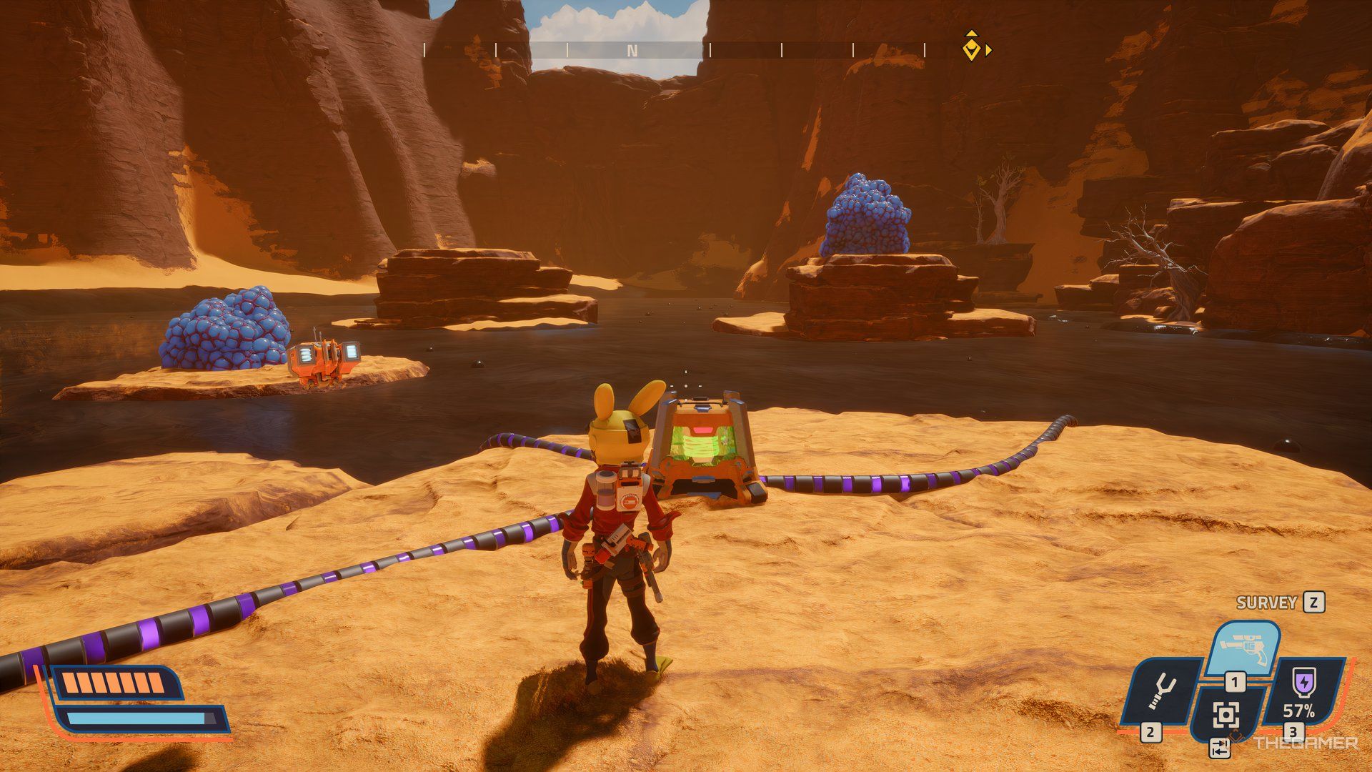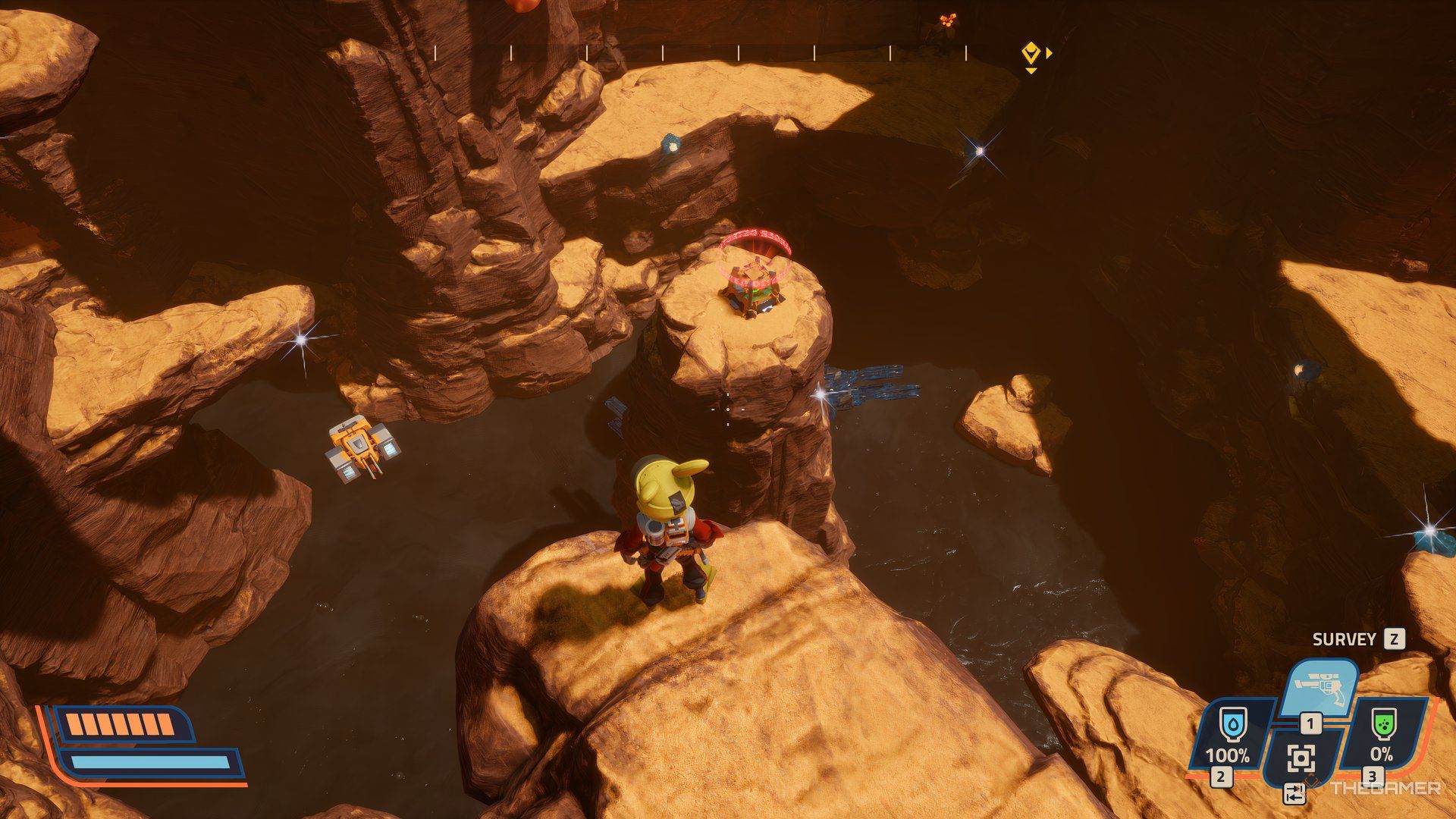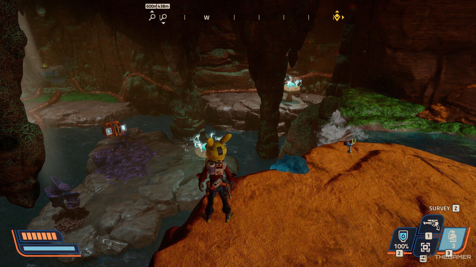 テレポーターをアクティブにすると西側この地域の、その後ろに行きなさい。これはあなたをaに導きます狭い経路それは行きます大きな峡谷。中央には、プリンタースラリーがあります。