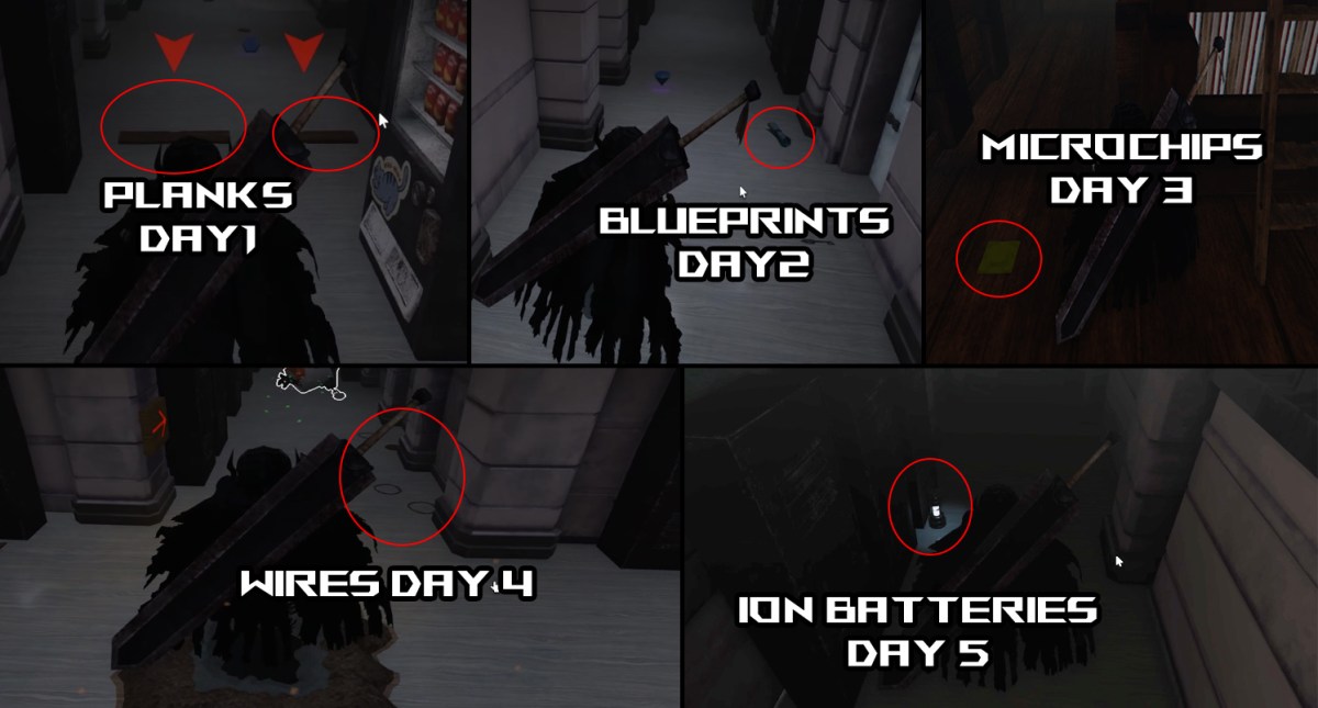- 進行アイテム:最初のレベルでは、特定の数の板を拾い、2日目に行くためにアートルームに持って行く必要があります。これは、毎日さまざまなアイテムに対して繰り返されます2日目などに青写真があります。これらのアイテムは学校の周りにランダムに配置されており、レベル中に出現することさえあるため、見続けてください。床のさまざまな部屋や教室のテーブルに隠れていますが、開くには鍵が必要なロッカーはありません。