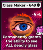 ![]() ガラスメーカー | •ガラス橋に誤ったガラスが見えます | •高価な端では、最大レベルでの途中でのみ表示できるアップグレードとは異なり、すべての誤ったガラスを見ることができます •これを取得する予定がある場合は、ガラスビジョンをアップグレードしないでください •このゲームをパスすることなく、ガラスブリッジ中にチャットでプレイヤーをトロールすることができます。 |