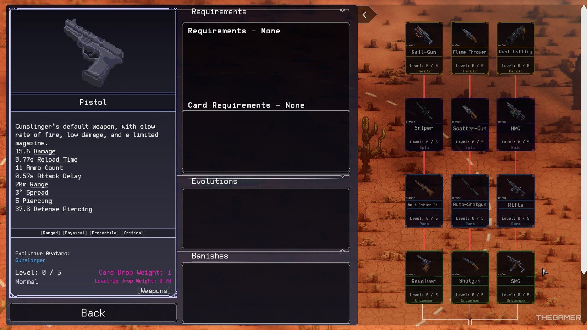 Gunslingerは、武器の代替システムを使用しています。スターティングピストルは、スナイパーライフル、ショットガン、自動ライフルの3つの異なる方向に進化できます。