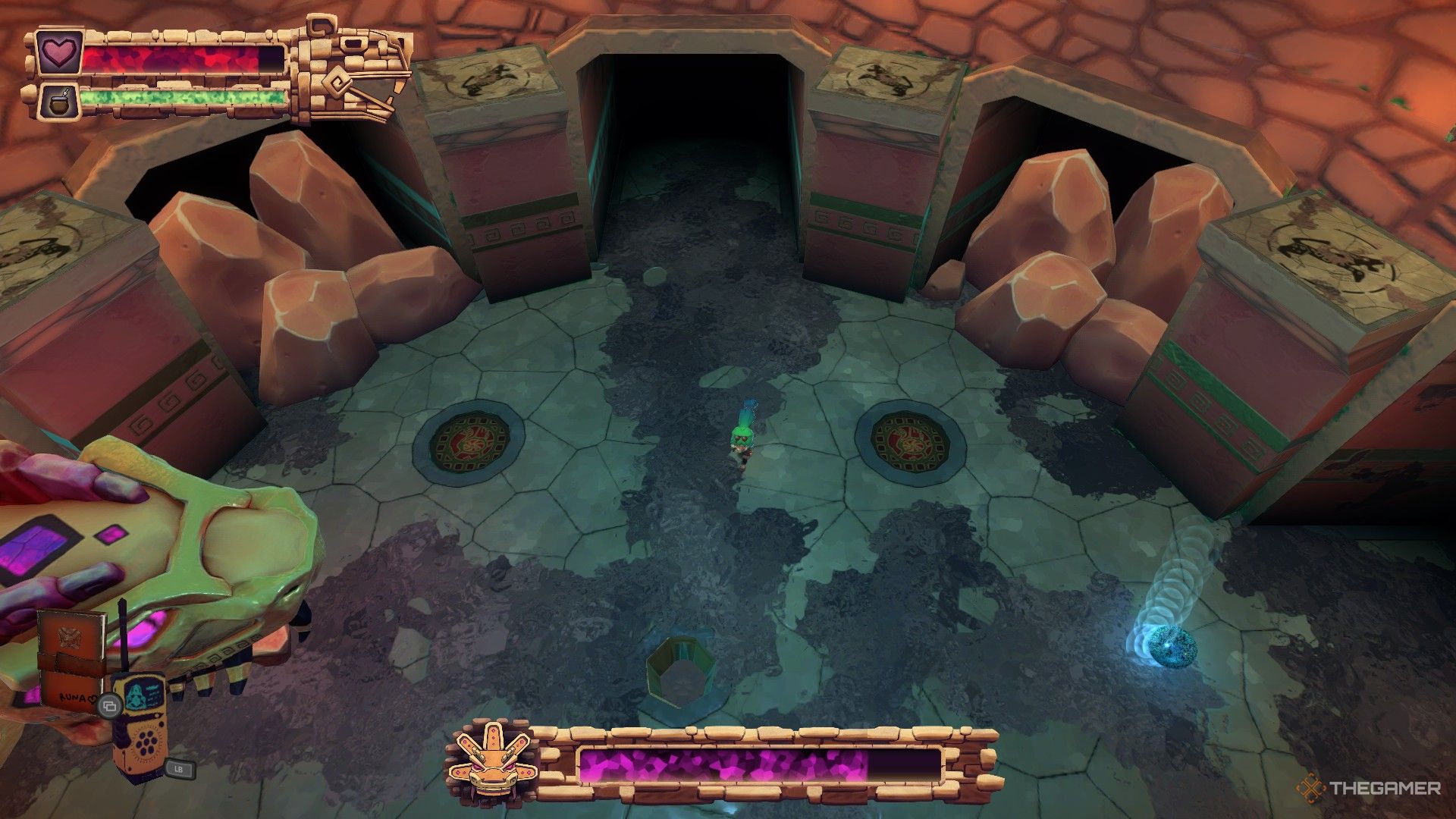 ラナの最初のボスは巨大なヘビです。あなたは小さな部屋から始めて、その脆弱な尾を打つ間、その攻撃を避けます。ヘルスバーが枯渇すると、ヘビはあなたの攻撃の免疫になり、シナリオが変わり、やるべきことは1つだけです:脱出!カメラが変わり、画面に向かって走っています。 1つのミスステップとヘビがあなたを食べて、最初からシーケンス全体を再開します。