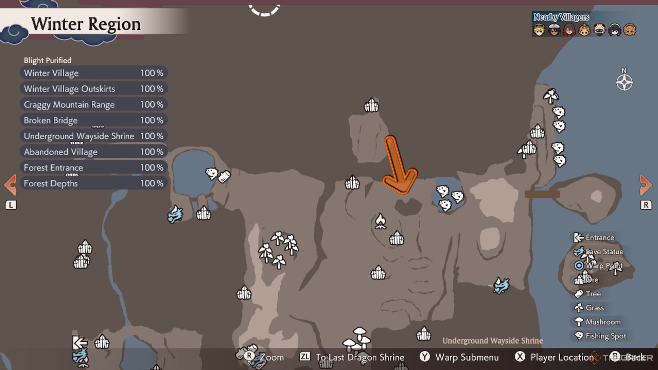 既に予想されるように、4つの地域すべてにオニギリの穴があり、冬の領域は最後の地域です。ここのスポットはに配置できます東のプール近くの冬の村の郊外の北側。このプールには左に岩があり、近くにキャンプファイヤーがあり、メインストーリーを継続することで自動的にそれを乗り越えることができます。
