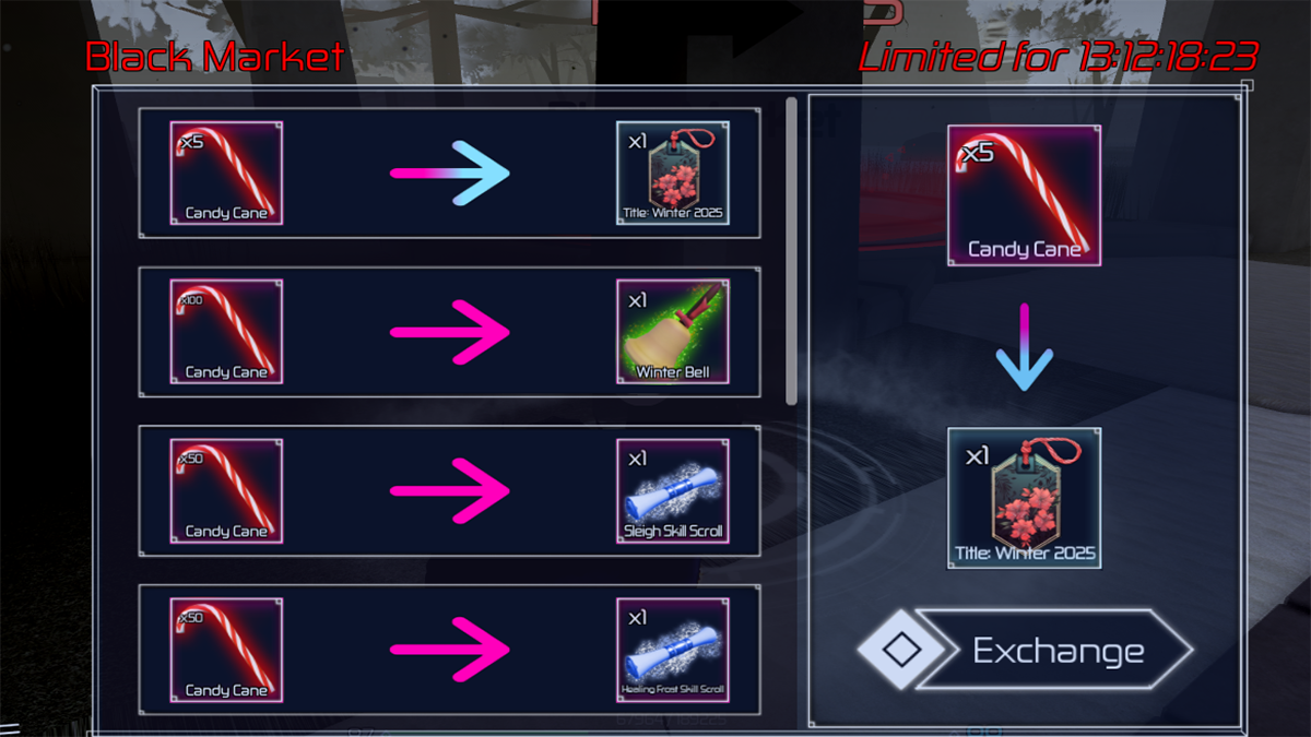 キャンディケインは、闇市場NPCの禅森林ハブで使用されています。それらを通貨として使用して、特別な冬の更新期間限定アイテムを購入します。これらには以下が含まれます: