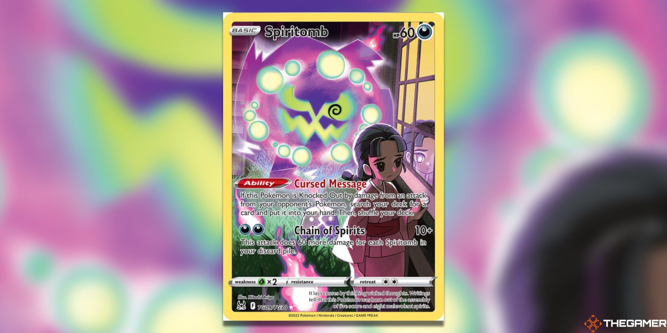 Comfeyのより落ち着いた色とより暗い背景に続くのは、Spiritombです。これは、いくつかの場所のチップスの袋の価格よりも低い価格であるもう1つの過小評価されているガラリアンギャラリーカードです。 Crown Zenithの高価なカードのコレクションはすべての注目を集めていますが、Spiritombは信じられないほど不気味なシーンで際立っています。