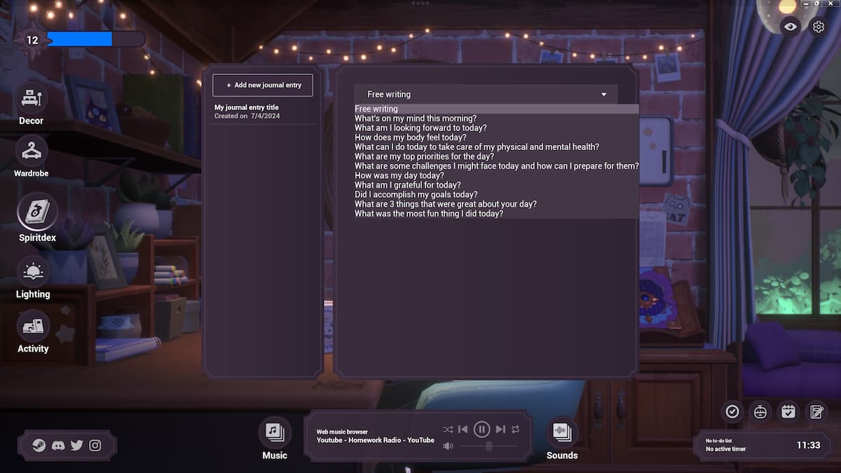 これらはすべて、オンラインまたは直接会うことができる簡単なツールかもしれません。しかし、スピリットシティはそれらをすべて一緒に連れて行き、それらを使い続けたいと考えています。楽しいアニメーションの背景と平和な音楽を組み合わせることで、携帯電話を押すだけの簡単なボタンではなく、全体の体験が得られます。私はすべてのジャーナルのプロンプトに巻き込まれ、楽しみのためだけにTo-Doを記入していることに気づきました。生産性と健康的なライフスタイルを刺激し、時間をかけて物事を考えて平和を感じます。そして、それをするために退屈する必要がないことを証明しています。