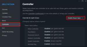 - [コントローラー]タブで、を選択します蒸気入力を無効にします下のオプション分割フィクションのオーバーライド