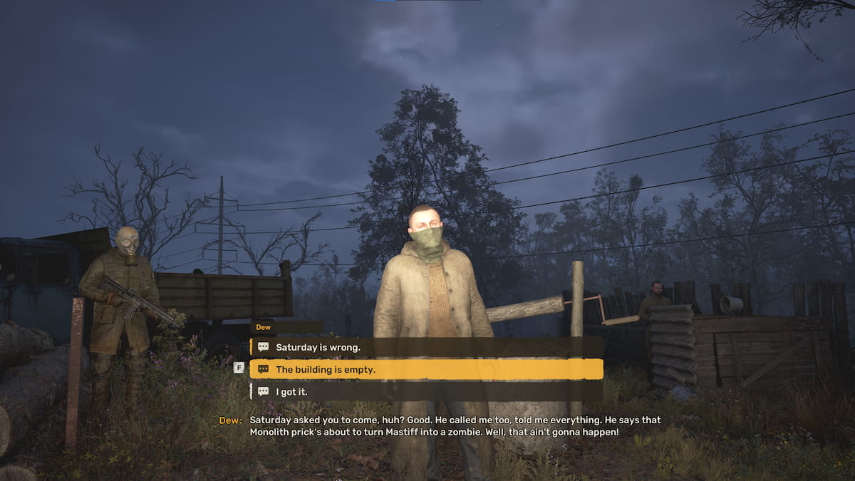 モノリスを崇拝した人々は、多くのストーカーに大いに嫌われているため、これは難しい選択になる可能性があります。のための簡単なルートが必要な場合ストーカーと一緒に立っている派ionを増やすと、すぐに9番目を排除することがより良い選択です、そして外の人々はそれをしてくれてありがとう。 9番目を取り出すことで、彼の体と彼のAKM-74を略奪することができますが、これは最高の品質ではありませんが、他の場所で修理できます。また、PDAを受け取って、モノリシア人が他の場所に集まっていることを知ることもできます。