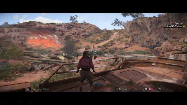 ほこりが落ち着いた後、nix最近クラッシュしたスピーダーに警告し、彼に従うように促します。丘の頂上に着いたら、パイクシンジケートの敵が飛び出して攻撃します。これらの人に正常に対処するか、左に橋を使用して攻撃をこっそり攻撃することを選択できます。