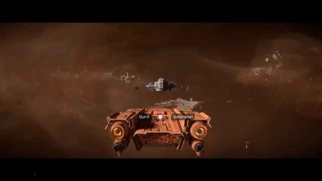 あなたはまだ森から出ていません。スペースに着くとすぐに、帝国の将校からの「日常的な検査」に止められ、立ち上がって検査されるように頼みます。あなたが立ち上がることを選択した場合、いくつかのシンジケート船が現れて熱を脱ぎます彼らがお互いに戦うように、あなたのあなたのシステムから逃れることを可能にします。私の意見では、これは「銃」よりもはるかにクールなオプションです。