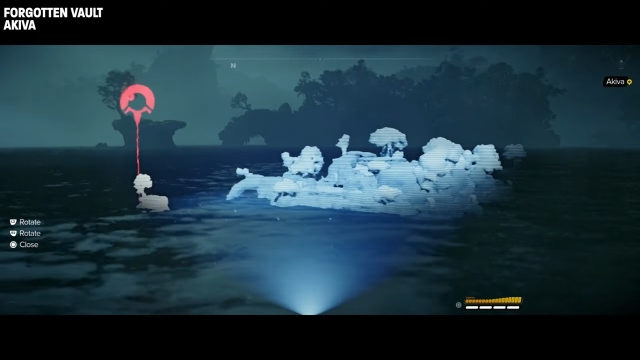 魔女の指のすぐ西にある湖に向かい、ホロトラッカーを育てて、あなたの場所をディスクと一致させます。それはあなたが行く必要がある岩がどこにあるかを指摘します。上に木がある1つの背の高い島が見えます。ここに向かい、この背の高い島の左側にある岩を探してください。