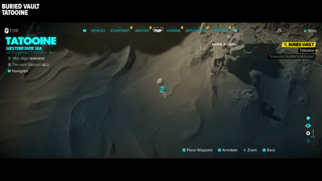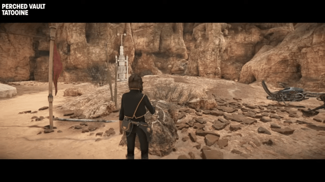 このピットには、洞窟につながる張り出した岩があります。洞窟の入り口の左側、Holotrackerに入る場所があります。これとやり取りすると、目の前のはしごが落ちます。これは、スターウォーズの無法者にあるジェットコルドの遺産保管庫の最初の入り口です。