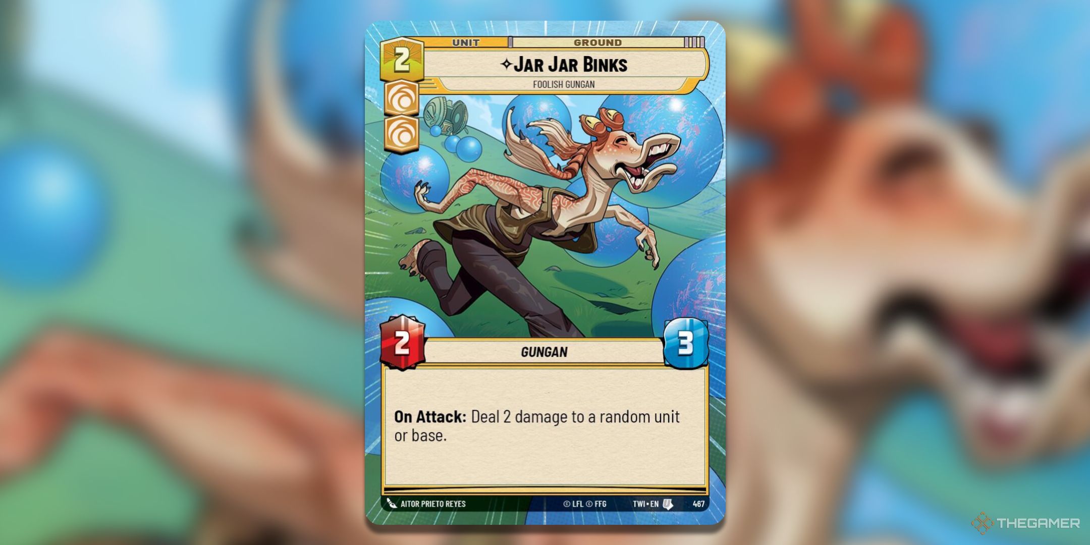 どちらかといえば、ジャージャーは彼のスターウォーズ:ゲーム内の愚かなアートスタイルの1つを持つ無制限のカードを通して、冗談のキャラクターです。このガンガンは、彼が彼らの持ち株から誤って解放する一連の大きなブーマーから逃げています。彼の効果により、彼は愚か者のように振る舞い、基地で幸運なヒットを得ることができます。