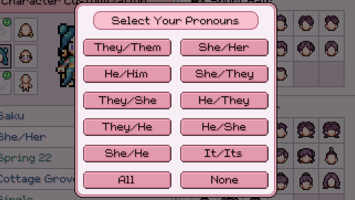 Stardew Valleyには代名詞がありません。男性と女性のキャラクターを選ぶことはできますが、それはあなたの性同一性に関してあなたのオプションの限界です。多くのプレイヤーが非バイナリであると特定しているため、大騒ぎせずにいつでも代名詞を切り替えることができることは間違いなく歓迎されます。 Mistriaのフィールドは、これをいつでも基本的なオプションとして提供しています。