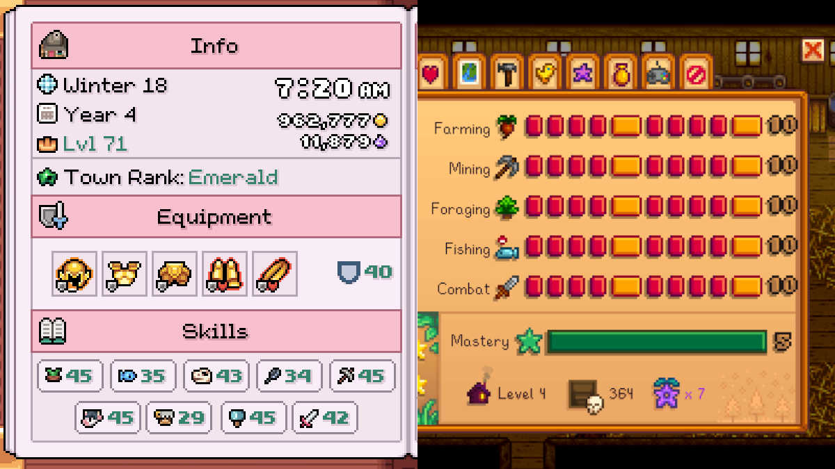 どちらも、新しいもののロックを解除するために増やすことができる複数の異なるスキルを持っています。 Stardew Valleyでは、各スキルには10レベルがあり、各レベルは新しいアイテムやレシピに報酬を与えて、途中でお役に立てます。すべてのスキルでレベル10に到達した後、追加の報酬を得るためにマスター洞窟のロックを解除できます。