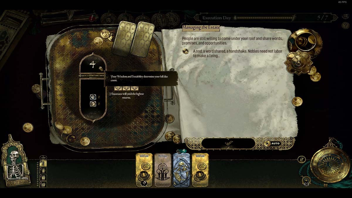 毎日の終わりに、あなたの割り当てられた貴族と奴隷は、彼らの成功を決定するためにサイコロの再ロールを受けます。サイコロが多いほど、高い報酬を確保する確率が良くなります。サイコロ数を最大化するには、2つの重要な統計の発生に集中してください。知恵そして社交性。