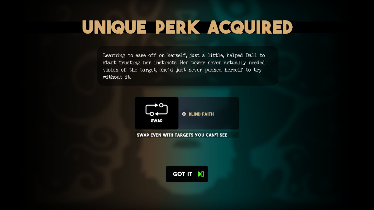 盲信は非常に簡単です。通常、スワップを使用して、Dallの場所と別のキャラクター、敵、または同盟国のみを交換できます。これは、いくつかの興味深い演劇への扉を開きます。スワップは1つのマナのコストですが、アクションを消費しません。そして、Dallに友好的な払い戻しの特典を与えると、チームメイトでそれを使用するときにManaは返金されます。これらの2つの特典を一緒に使用すると、Dallを使用して、いつでもチームメイトを別のチームメイトと交換できます。