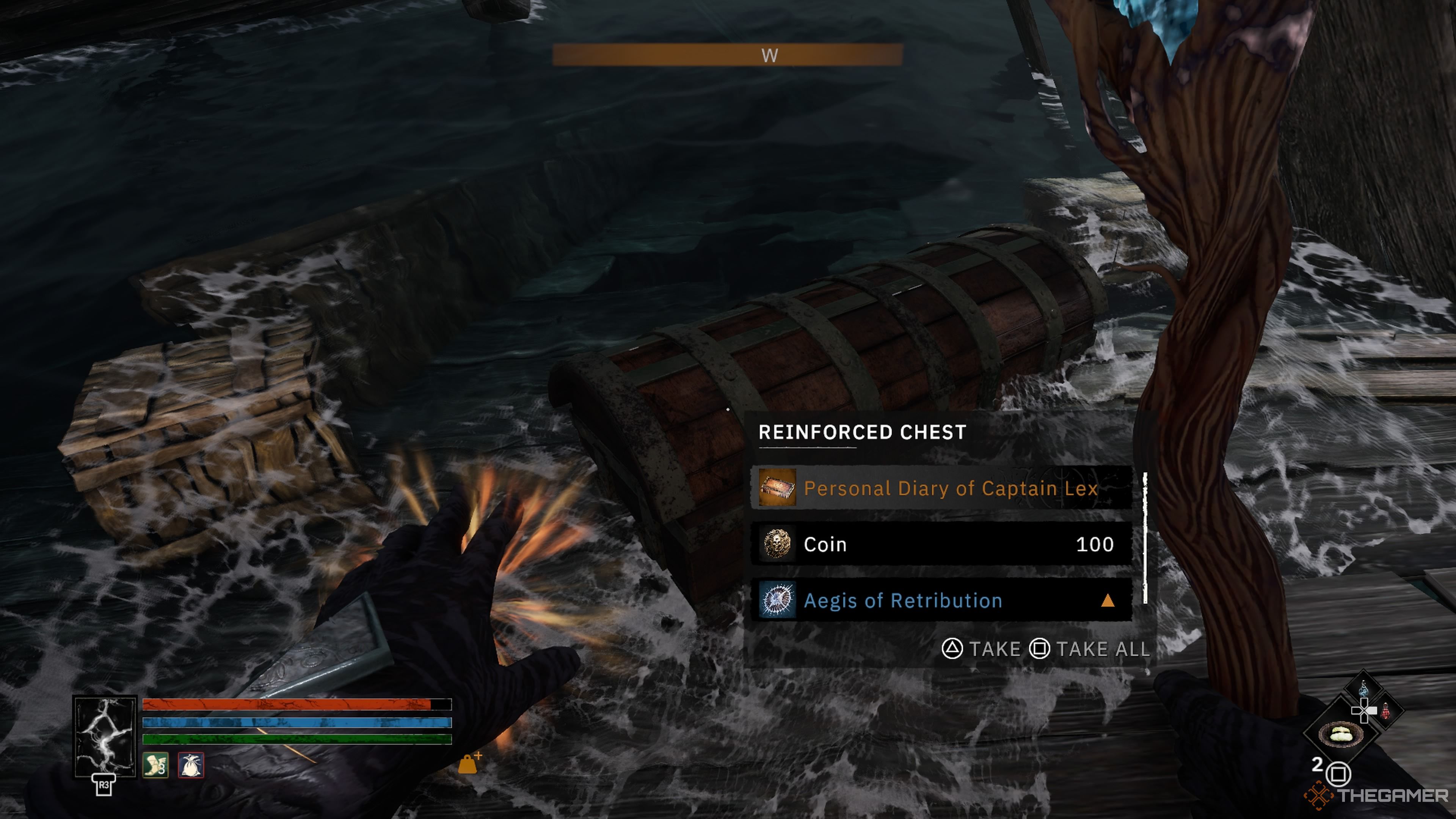 に行きます小さな島の右側、そしてあなたはaを見つけるでしょう袋の中の報復のマントいくつかの隣他の袋と骨の山、 そして巨大強化された胸で難破しますその中。開くために開きます100コイン、報復シールドのイージス、そしてキャプテンレックスの個人的な日記。