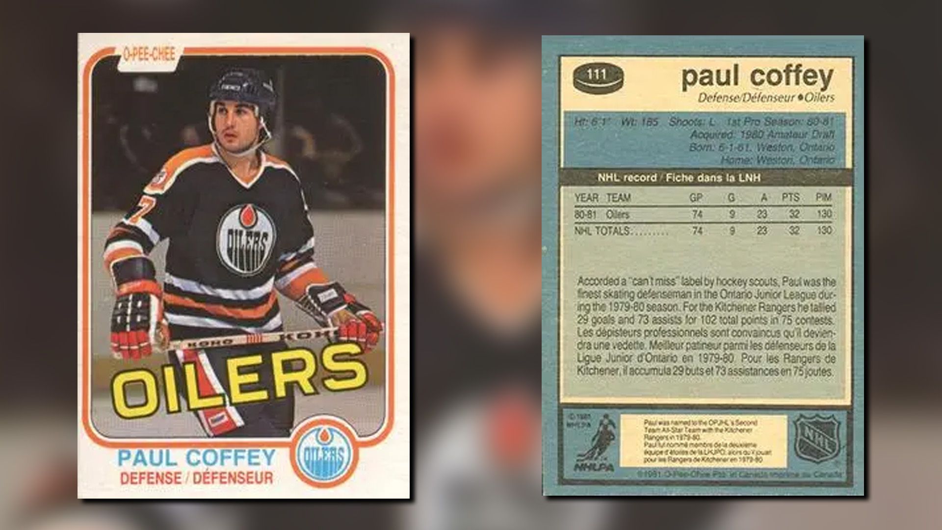 1981年のO-Pee-Chee#111は、Paul Coffeyの新人カードであり、NHLのキャリアの始まりをマークしています。