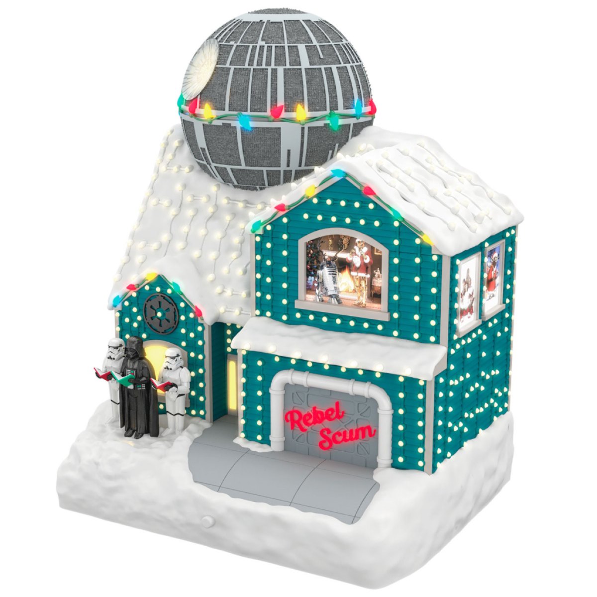 適切な名前銀河のメリストの家かなりのカンパイ校の休日の楽しみです。このテーブルトップの飾りは、スターウォーズのファンの机やダイニングルームのテーブルで素晴らしい目玉になります。この愛らしい装飾された家は、帝国がお祝いになること、ダース・ベイダーがストームトルーパーと一緒にキャロリングし、彼らの存在を知らせるために反乱同盟のグラフィティを特徴としています。 Clark Griswoldをjeするライトと、象徴的なスターウォーズのテーマを演奏するサウンドボックスが特徴です。